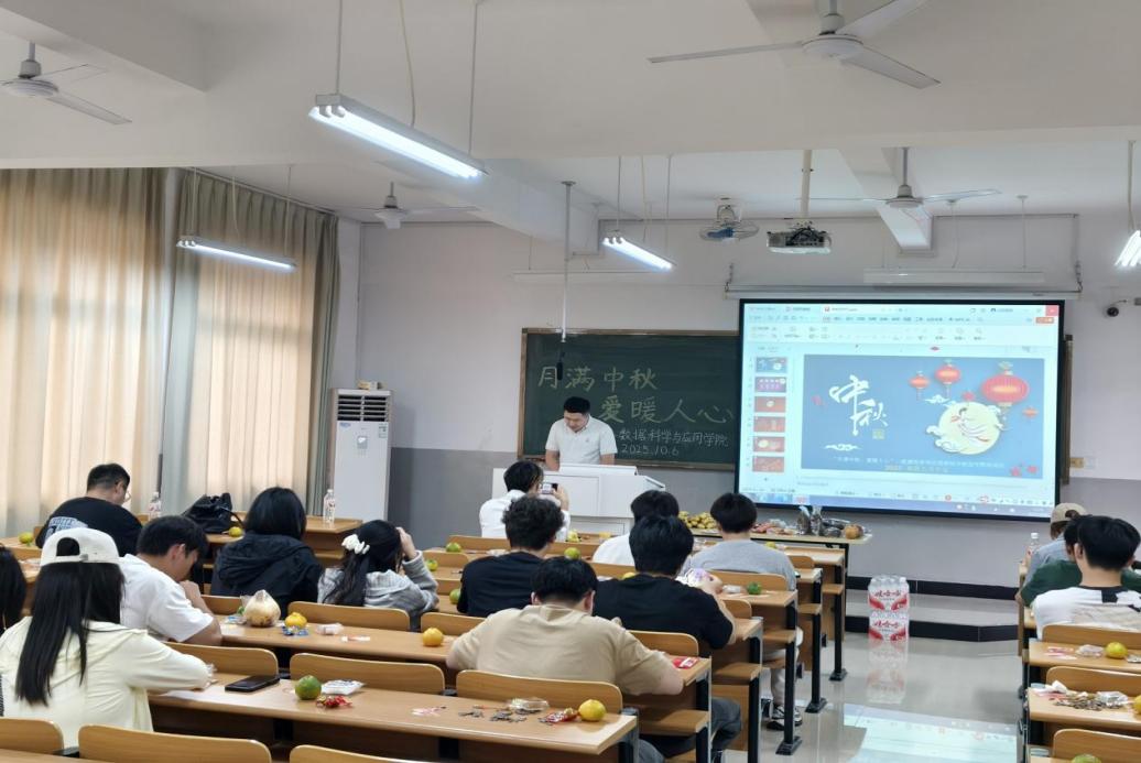 国庆与中秋双节之际,为传递党组织的深切关怀,丰富留校学生的假期生活,数据科学与应用学院于10月6日下午精心策划并举办了一场主题为“月满中秋,爱暖人心”的留校学生座谈活动。学院党总支书记刘根、教学秘书张宸铭以及多名留校学生共同参与了此次活动。