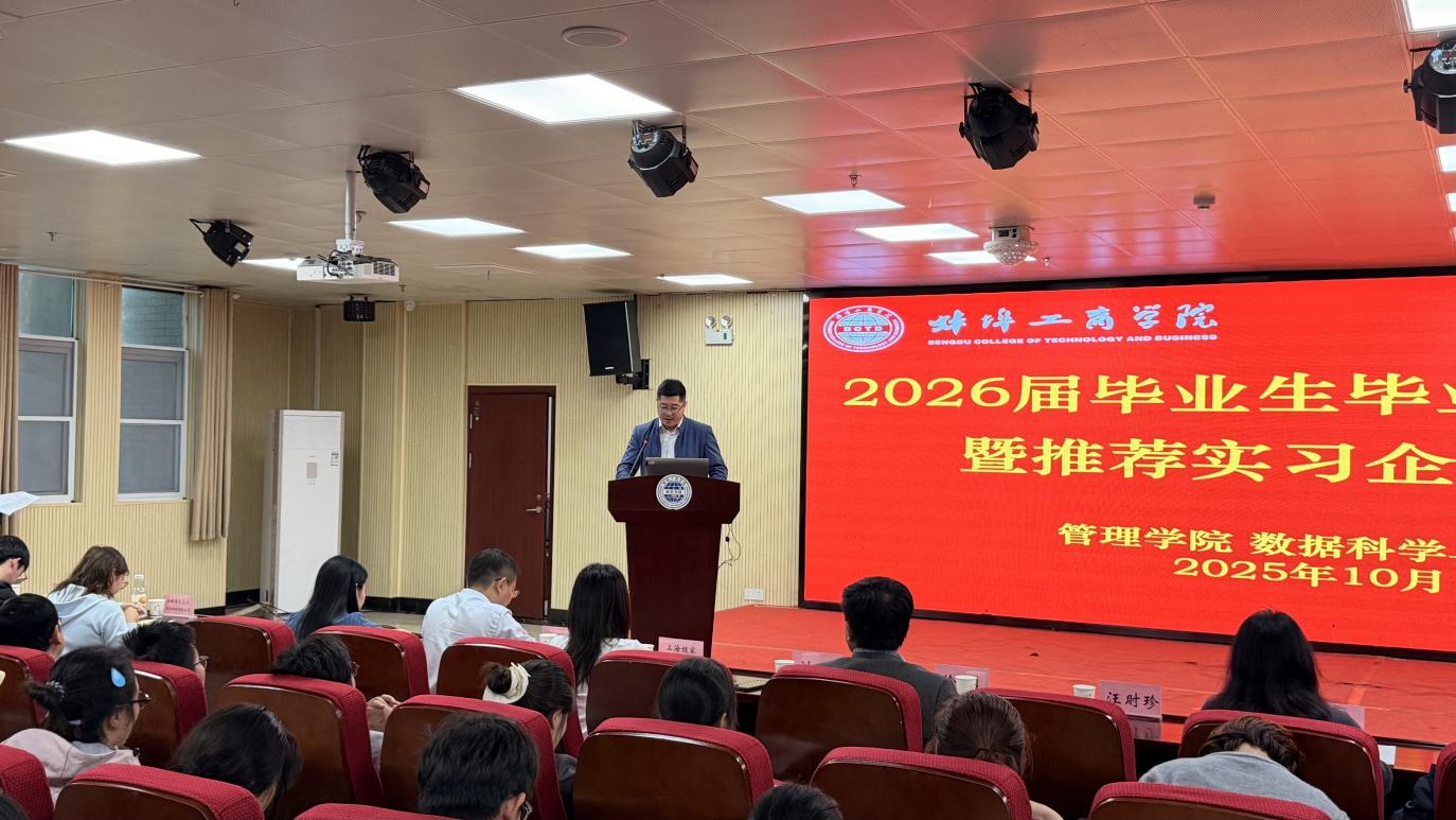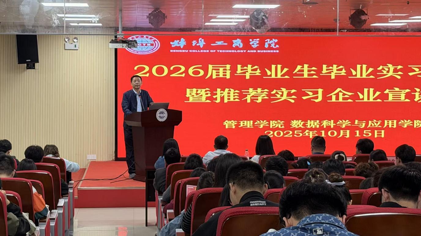 为深入推进产教融合、校企协同育人,帮助2026届毕业生明确实习目标、精准对接优质就业资源,10月15日,数据科学与应用学院、管理学院联合举办2026届毕业实习动员会暨推荐实习企业宣讲会。学校副校长汪时珍出席会议并讲话,学生处副处长兼就业指导中心主任王玲,数据科学与应用学院院长徐勇、党总支书记刘根,管理学院院长刘冬华、党总支书记阮进兵、副院长金诺,10家余家优质企业代表及500余名2026届毕业生共同参会。