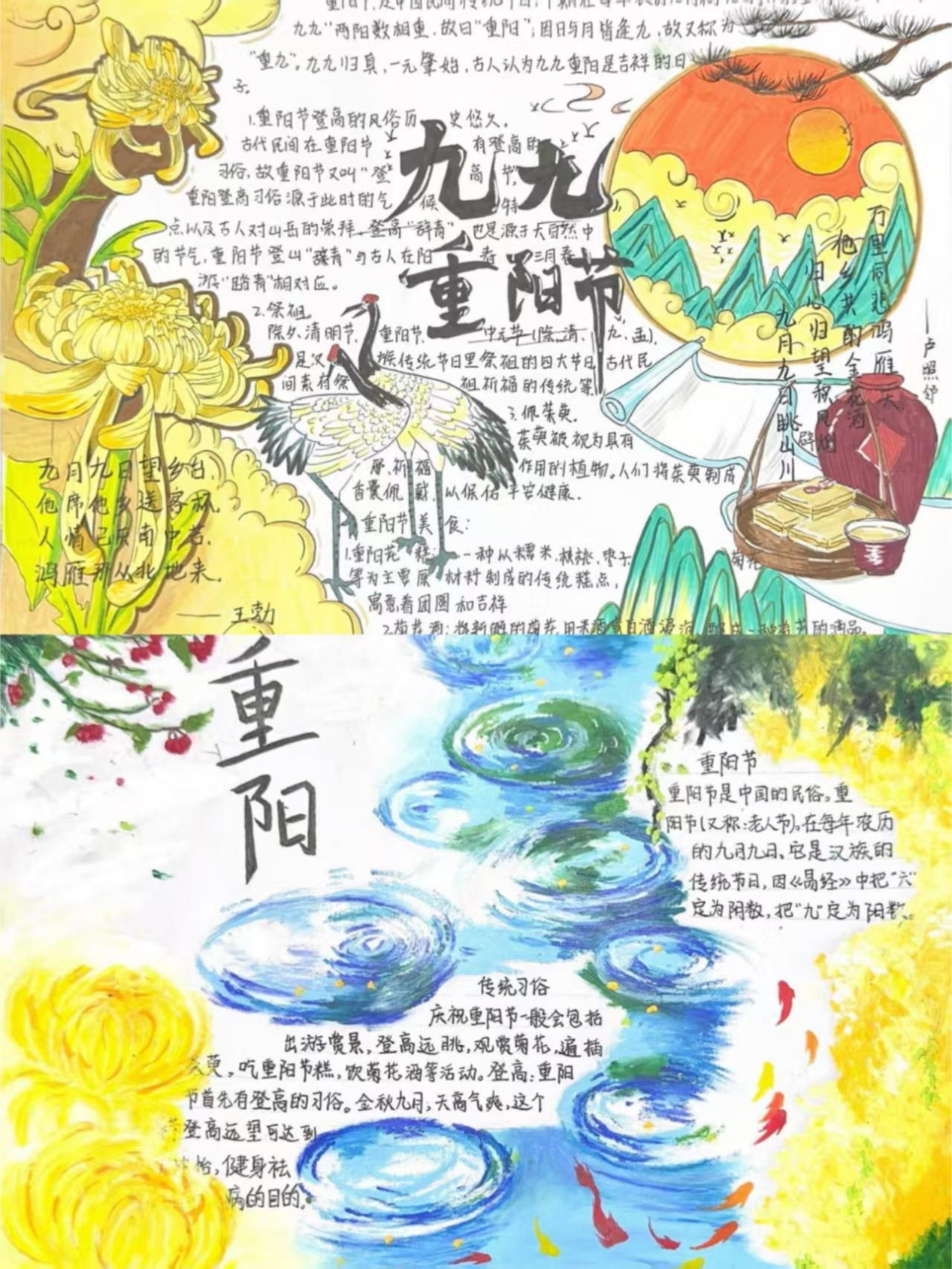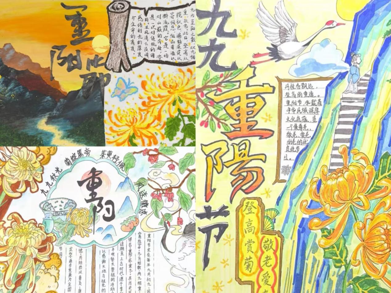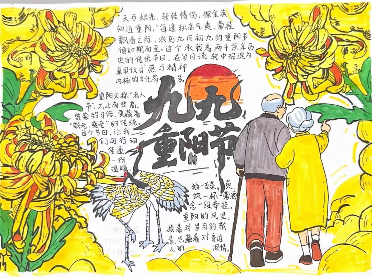 在此次活动中,同学们通过插画、书法、故事等多种形式,深刻诠释了对重阳节的理解,勾勒出重阳的独特风韵。有的作品借明黄菊瓣、衔云白鹤,晕染出“登高怀远”的悠远意境;有的则以暖色调定格银发伉俪相携赏菊的温情瞬间;更有作品巧妙地将《易经》阳数与茱萸习俗融入其中,织就一幅幅文化脉络。在这些作品中,传统不再仅仅是书页上的文字,而是化作了鹤翅间的风、菊瓣中的暖、相濡以沫的温柔——展现了青春与文脉的深情共鸣。