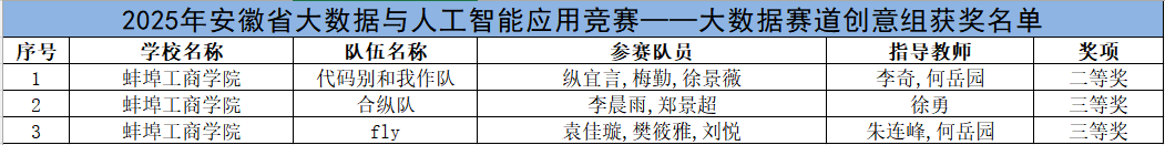 近日,从2025年安徽省大数据与人工智能应用竞赛组委会传来喜讯,我院参赛选手在省级决赛的激烈角逐中表现优异,再创佳绩。其中,来自数据科学与应用学院大数据产业学院的三支队伍凭借其创新的项目构思与扎实的技术能力,分别荣获省级二等奖1项、省级三等奖2项,充分展示了我院在应用型人才培养与大数据人工智能领域的教学成果。