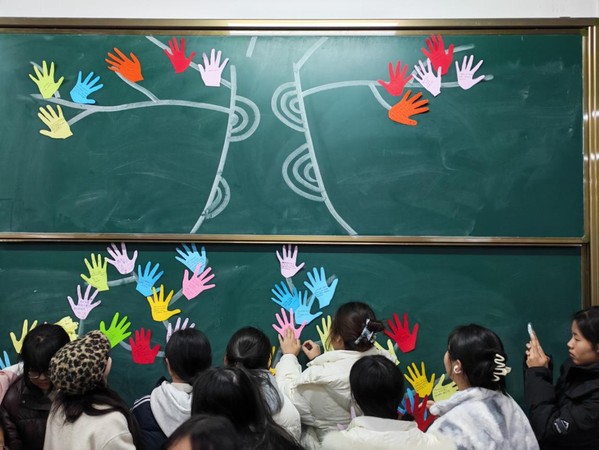 数小时的沉浸创作后,一张张普通彩纸蜕变为承载心意的艺术品。同学们围聚在展板前,将作品悉心拼贴、逐层组合。红纸上的“师恩难忘”映着敬意,蓝纸上的“挚友同行”藏着默契,黄纸上的叶片纹样叠成枝丫,最终汇聚成一棵生机盎然的“心树”。展板前,有人指着自己的作品分享:“这是剪给室友的,感谢她每次在我备考时的默默陪伴”;也有人轻声感慨:“第一次剪传统纹样,突然懂了老手艺里藏着的细腻心思”。每一件作品都是青春里可触可感的温暖印记。