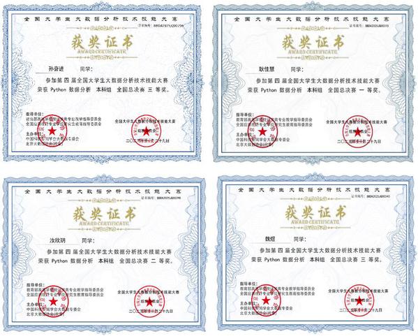 经过激烈角逐,共有五名选手晋级全国总决赛。11月22日,全国总决赛顺利结束。我校学子在此次总决赛中表现优异,取得了显著成绩。其中,23数据2班的耿佳慧荣获Python数据分析全国一等奖,汝欣玥荣获Python数据分析全国二等奖;23数据1班的魏煜和23数据2班的孙奋进分别荣获Python数据分析全国三等奖。他们凭借扎实的专业知识和技能,充分展现了新时代大学生的创新精神与实践能力。
