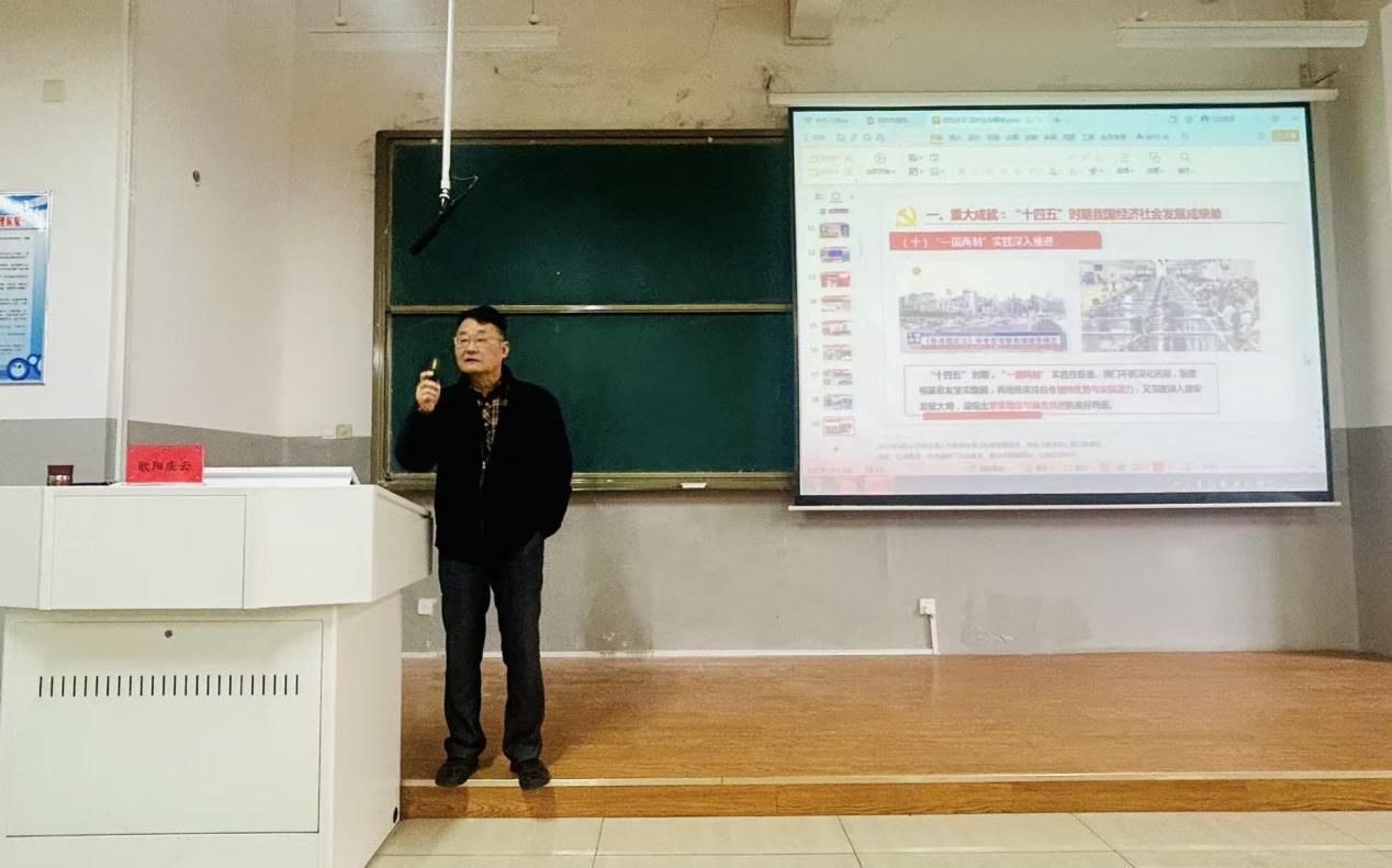 首先汪阳率先向全体参会人员郑重介绍了主讲嘉宾马克思主义学院欧阳庆云教授,强调此次宣讲将为大家精准把握全会精神实质、明晰“十五五”发展蓝图提供权威指导。其次欧阳庆云围绕全会精神展开了系统解读,从五个维度进行了深入细致的分析。在“重大成就”部分,他运用详实的数据展现了“十四五”时期我国经济社会发展的出色成绩,生动体现了中国式现代化的坚实推进。谈及“重大意义”时,欧阳庆云指出,“十五五”时期是为基本实现社会主义现代化夯实基础、全面推进的关键阶段,具有承前启后的重要意义,全会的部署为续写“两大奇迹”新篇章提供了行动指南。在“形势判断”环节,他深入剖析了当前“战略机遇和风险挑战并存、不确定难预料因素增多”的发展形势,强调我国制度优势、市场优势、产业体系优势等长期向好的基本面未发生改变。对于“核心要义”,欧阳庆云解读了“十五五”行动纲领的内涵,详细阐释了以推动高质量发展为主题、以改革创新为根本动力的指导思想,以及“六个坚持”的重要原则。最后,在“贯彻落实”部分,他呼吁全体同学深刻领会“两个确立”的决定性意义,以“雷厉风行的执行者、攻坚克难的行动派”姿态积极作为。