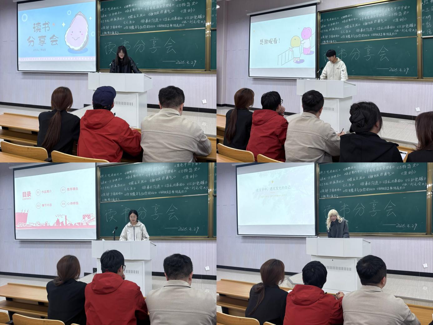 活动现场氛围热烈,5位分享者依次登台,结合自身阅读感悟带来精彩分享:23经统班章惠惠以《带壳的牡蛎是大人的心脏》为切入点,传递平凡生活里的温柔与坚韧;25应数班刘邦泽解读《水浒传》,剖析侠义精神与时代担当;24应统班刘怡蕊分享《做一个对社会有用的人》,结合专业畅谈青年使命;25应数班潘洪亮品读《人生》,探讨理想与选择的辩证关系;24经统班朱敏则以《钢铁是怎样炼成的》诠释坚韧奉献的精神内核,每一段分享都赢得现场阵阵掌声。